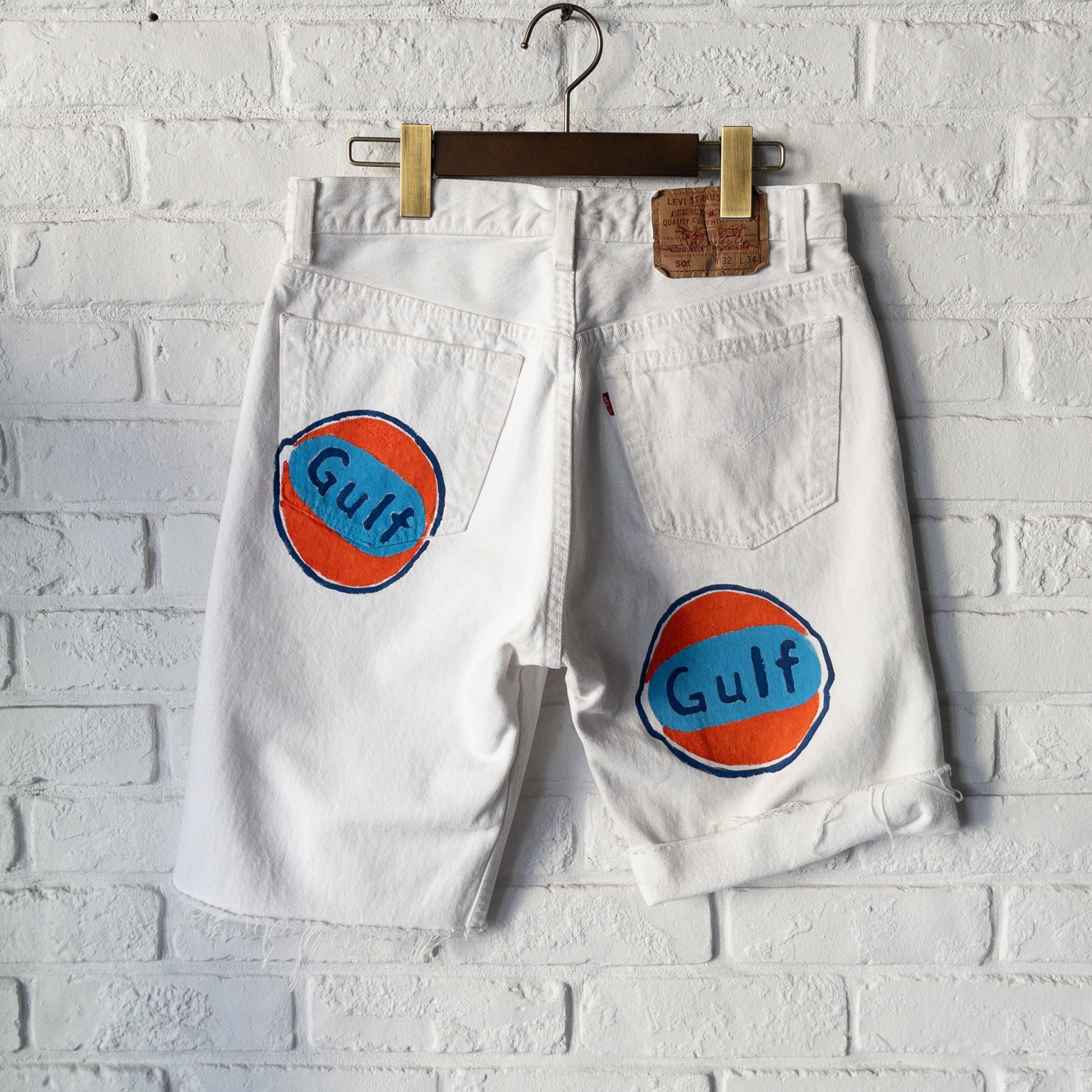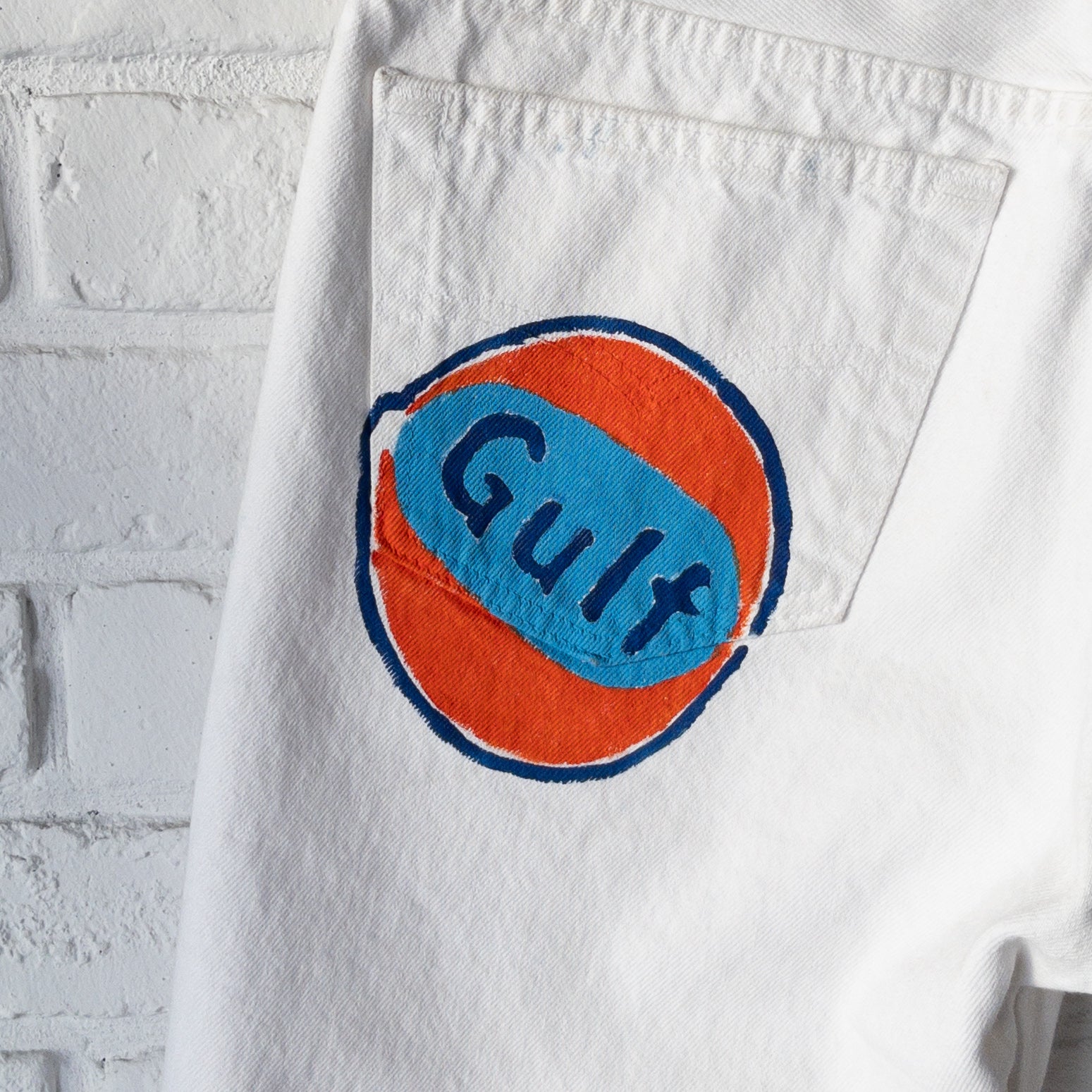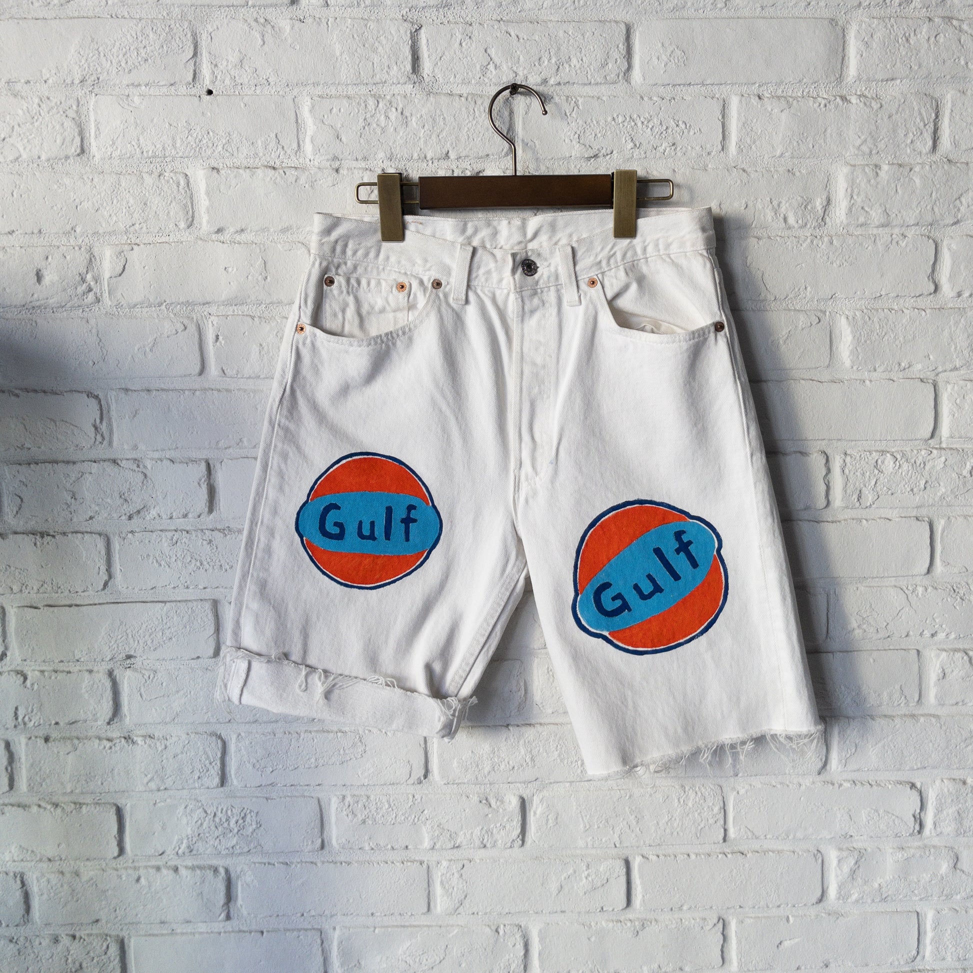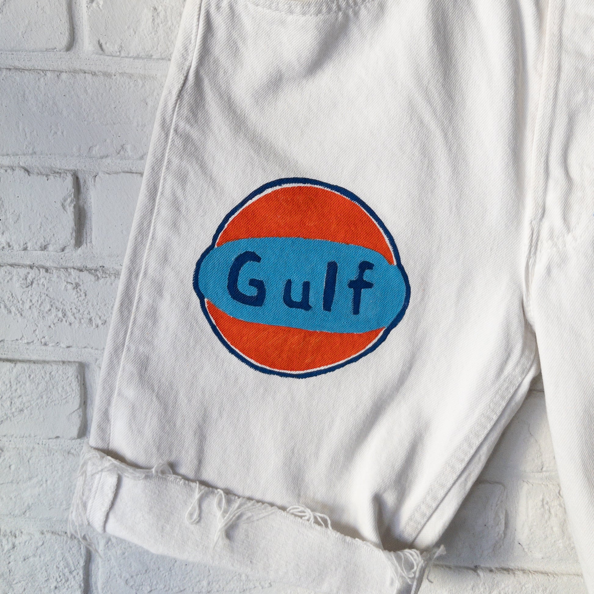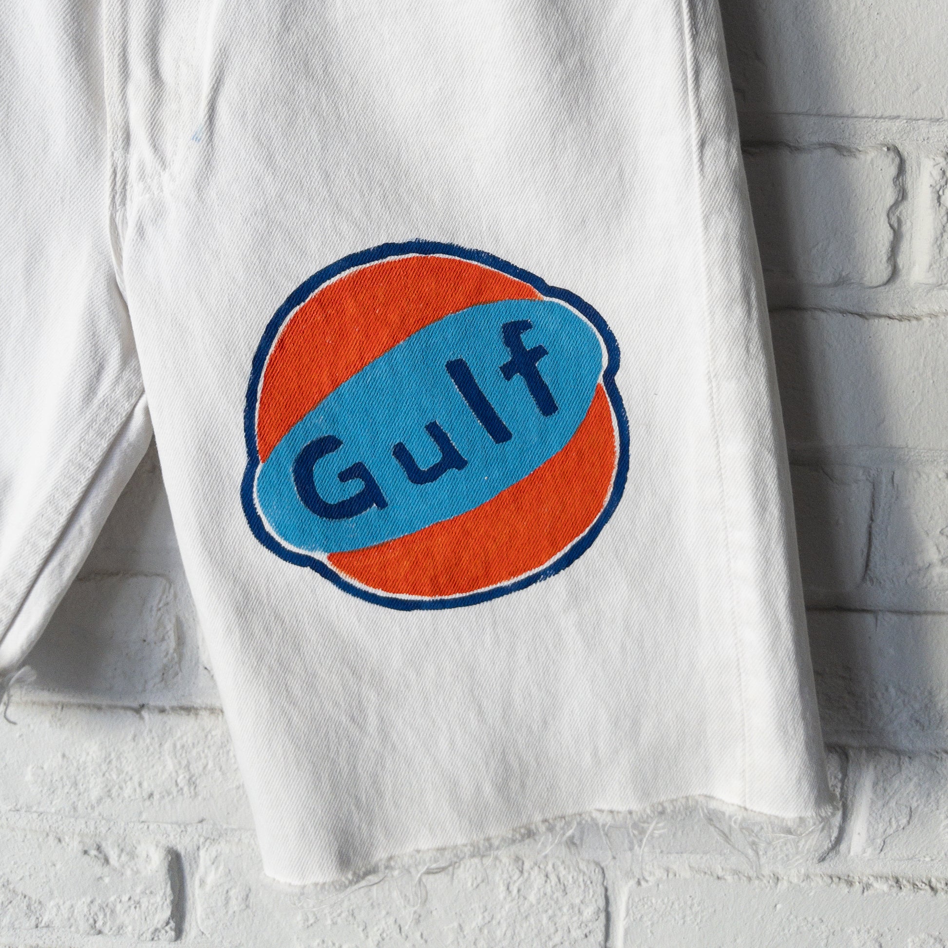 アメリカのオイルカンパニー”GULF”のロゴがペイントされたショートパンツ。色鮮やかなロゴと切りっぱなしの裾が夏らしいラフさを演出します。