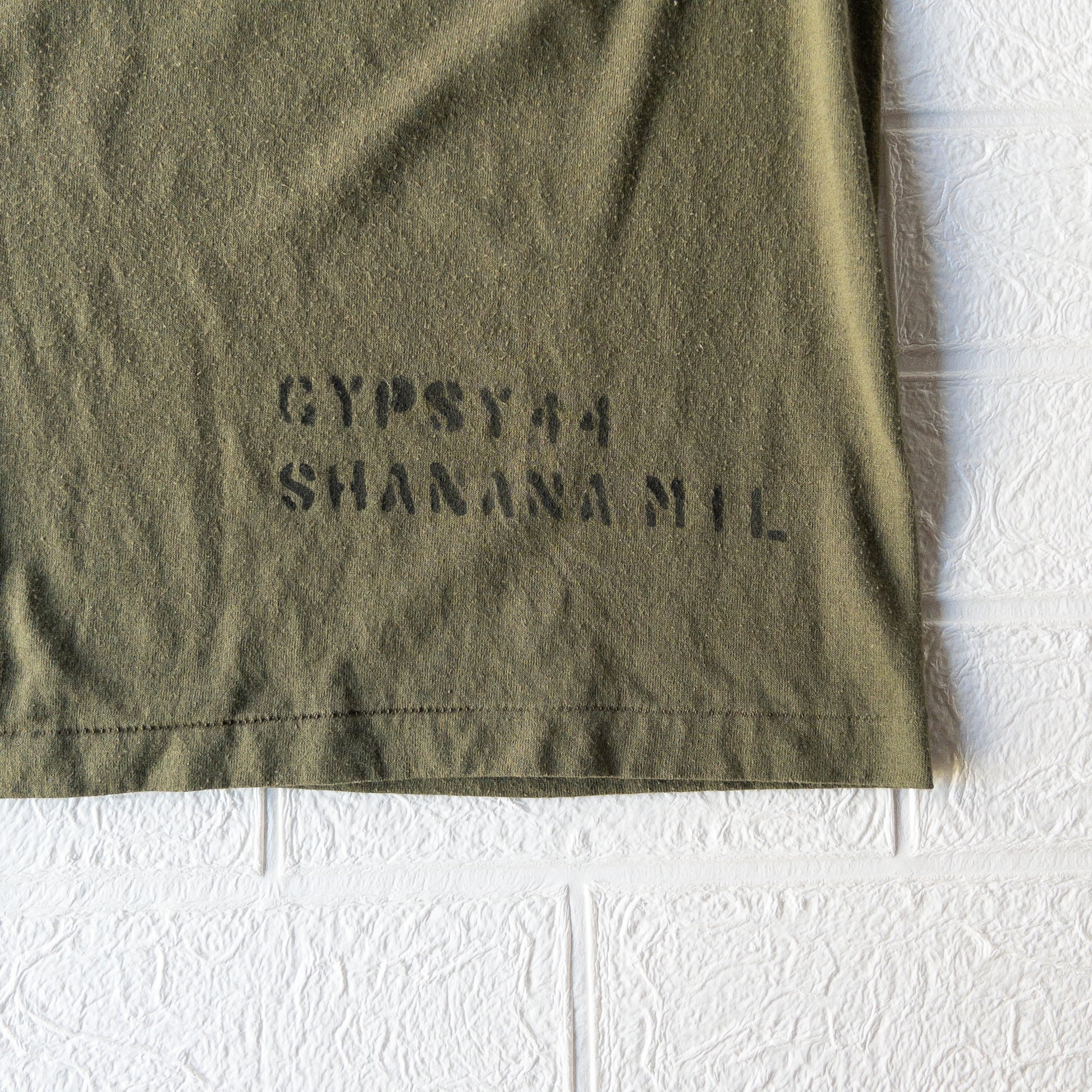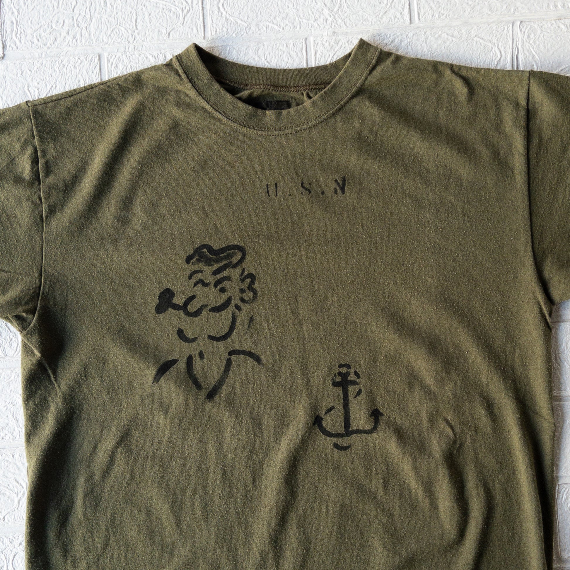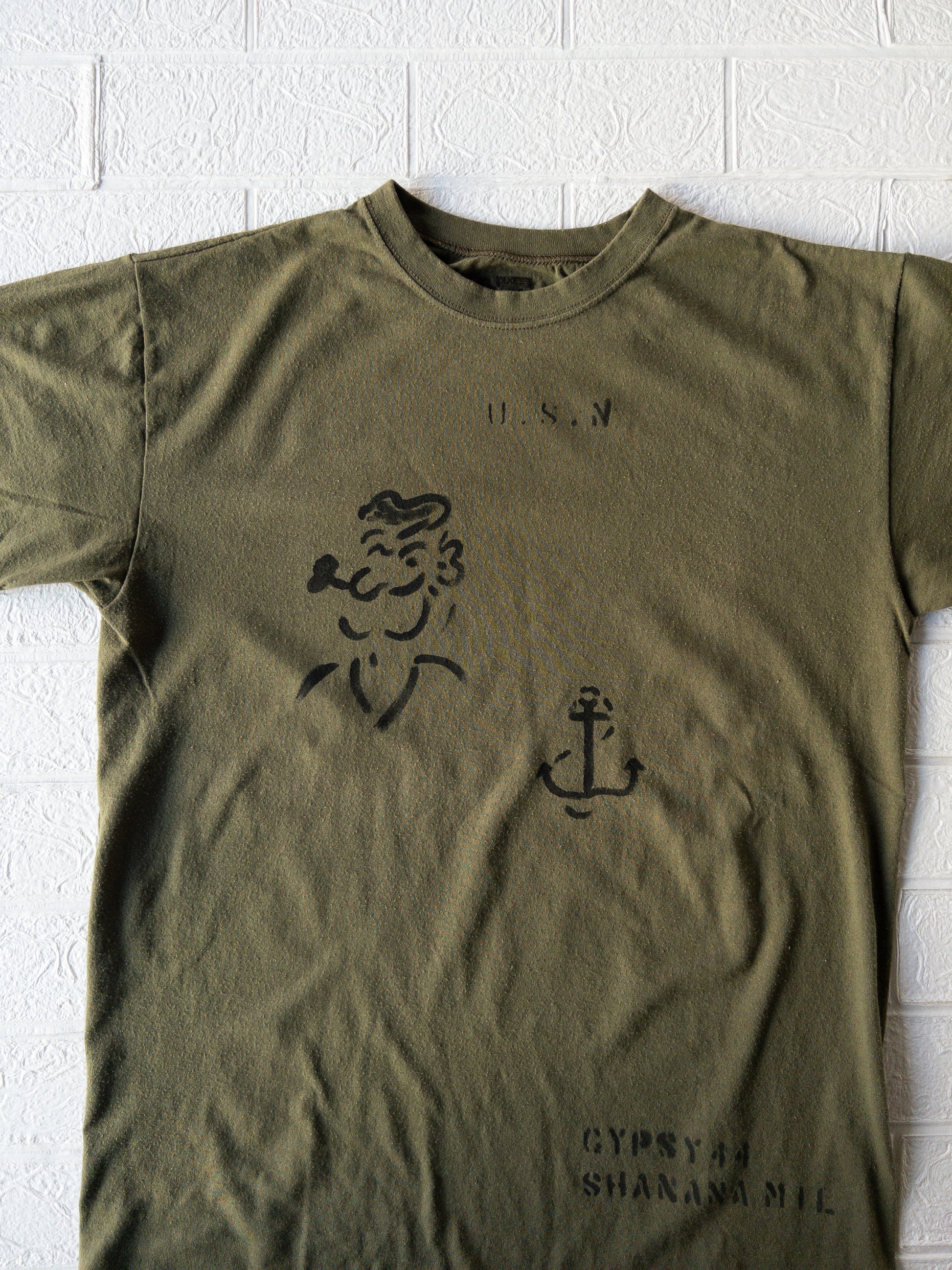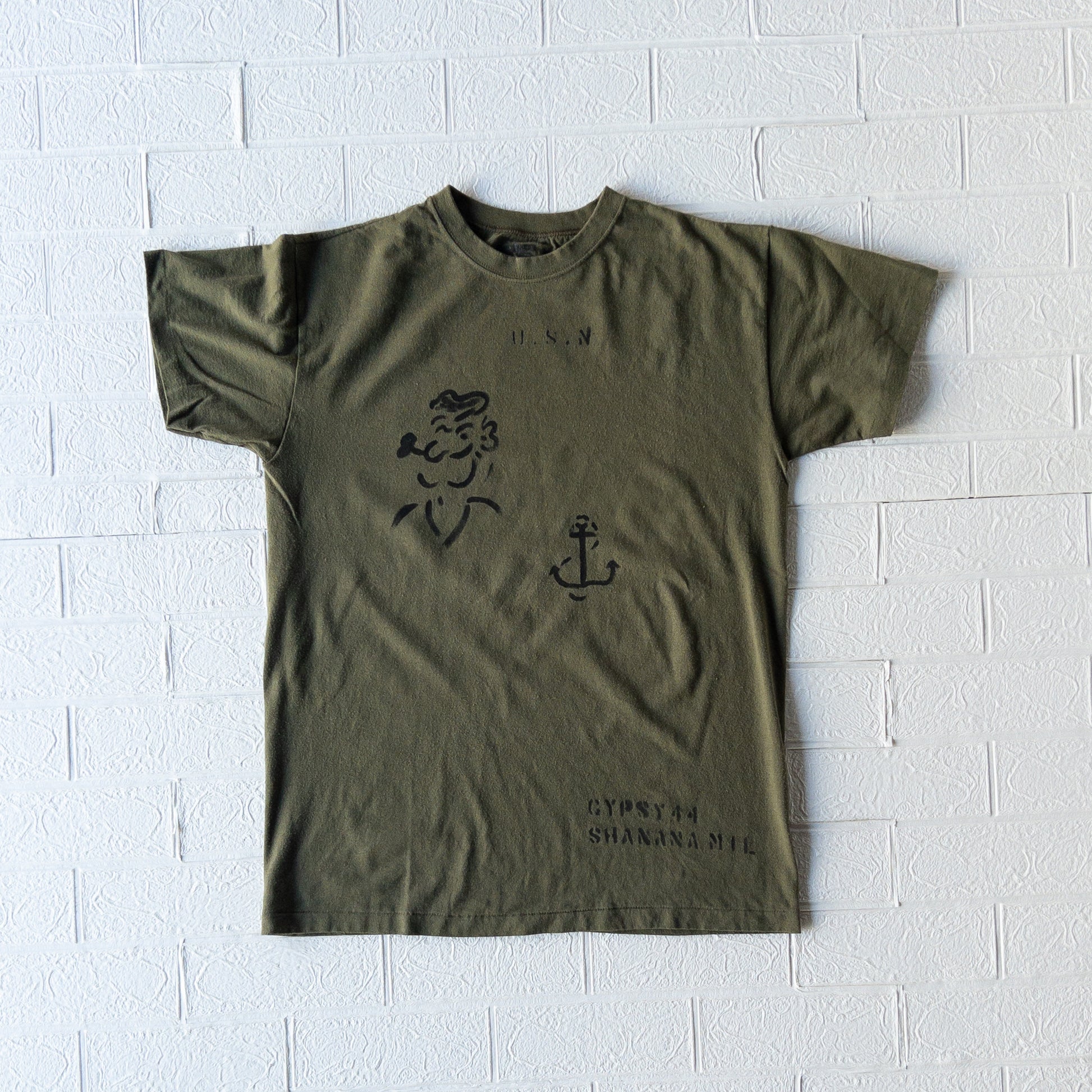 アメリカでミリタリア(VINTAGE MILITARY DEALAR)としても活躍されてる”SHANANA MIL”デザイナー、Mr.GYPSYが"GYPSYCOLLECTION"としてUSMCのビンテージミリタリーTシャツにハンドペイントで1940年代WW2期頃当時アメリカ海軍(U.S. NAVY)でもモチーフやキャラクター引用されてたポパイ柄とアンカーマークをアレンジしたデザインです。無骨なミリタリーの無地Tシャツにハンドペイントがアレンジされたラキッドなシリーズです。