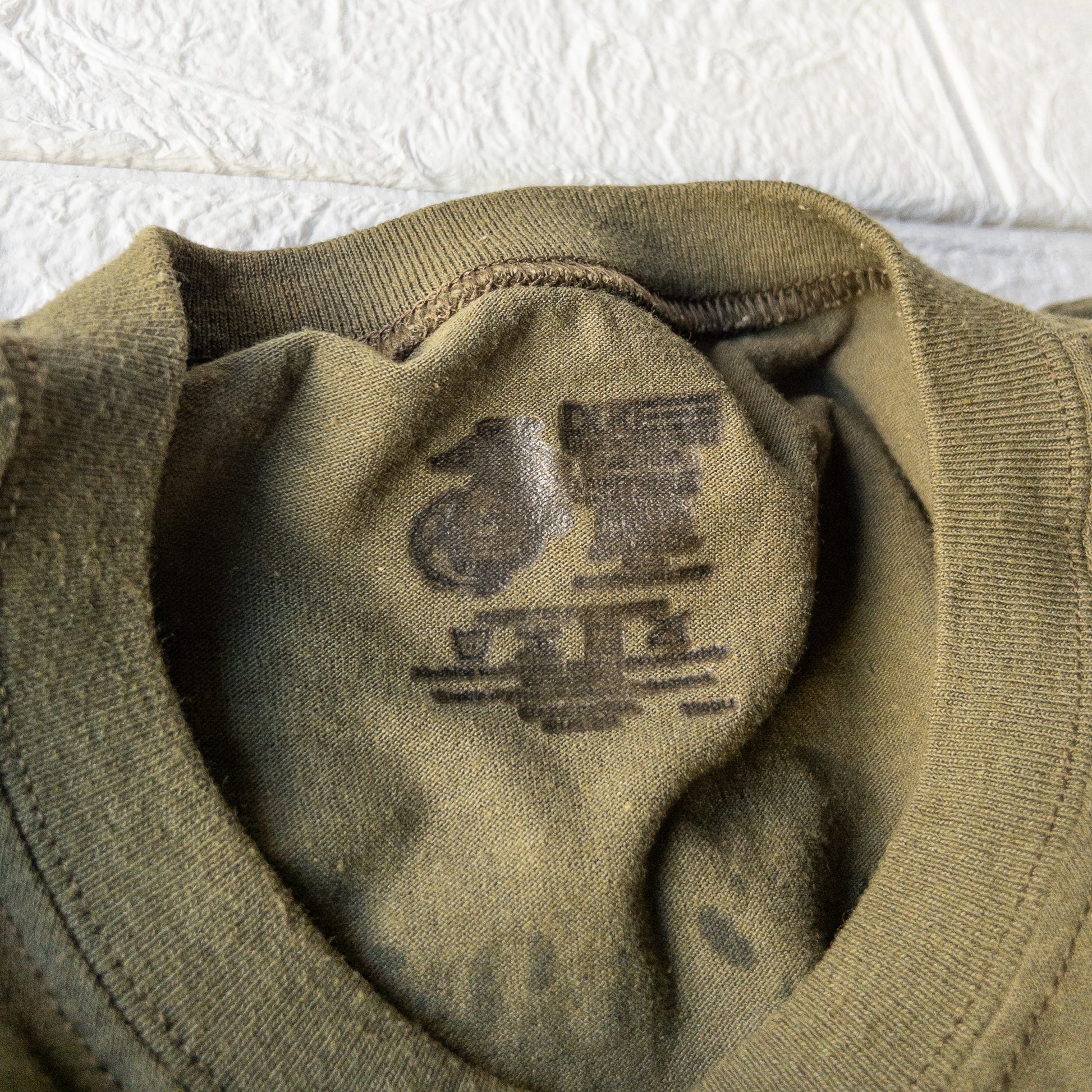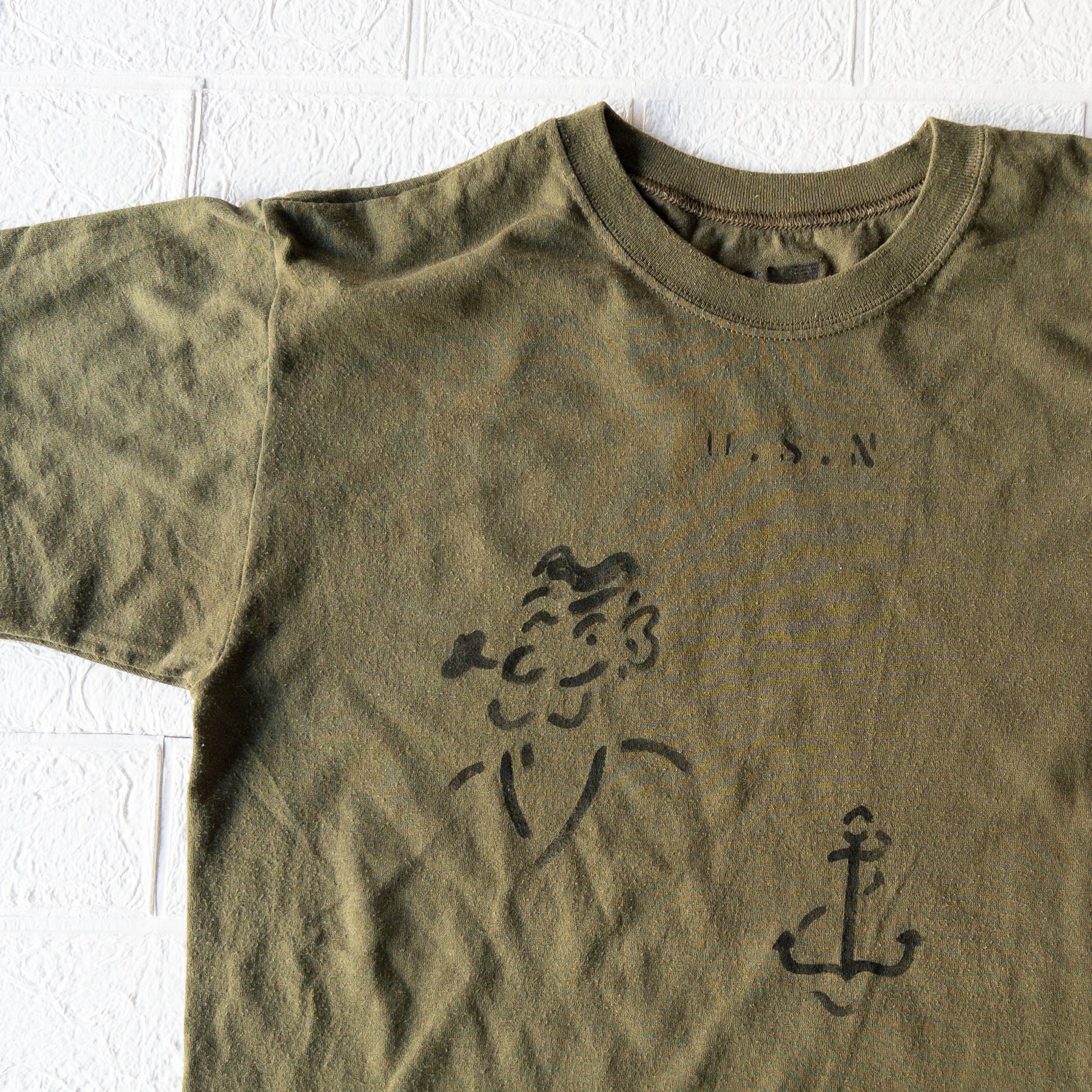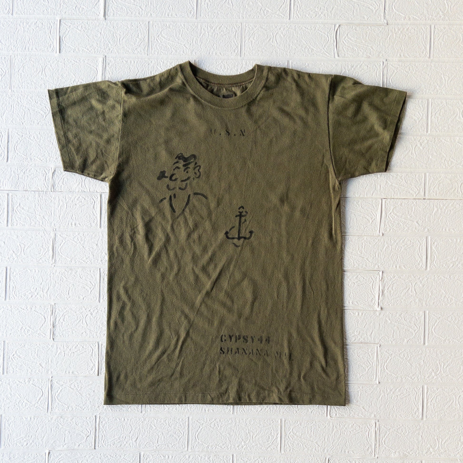 アメリカでミリタリア(VINTAGE MILITARY DEALAR)としても活躍されてる”SHANANA MIL”デザイナー、Mr.GYPSYが"GYPSYCOLLECTION"としてUSMCのビンテージミリタリーTシャツにハンドペイントで1940年代WW2期頃当時アメリカ海軍(U.S. NAVY)でもモチーフやキャラクター引用されてたポパイ柄とアンカーマークをアレンジしたデザインです。無骨なミリタリーの無地Tシャツにハンドペイントがアレンジされたラキッドなシリーズです。